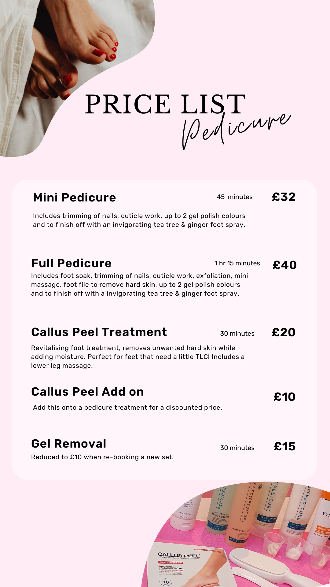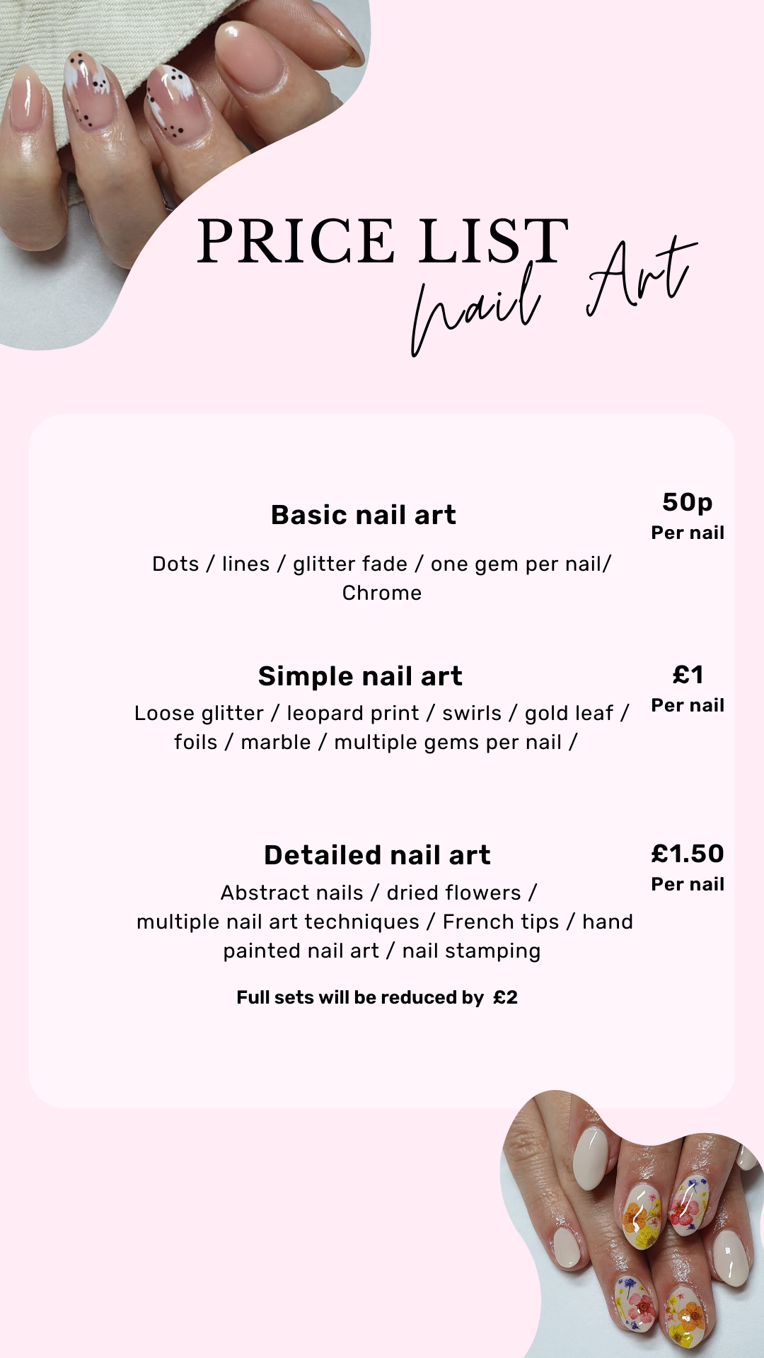 Please make sure you have let your therapist know if you would like any nail art in advance to your appointment, if you ask on the day this may not be possible.